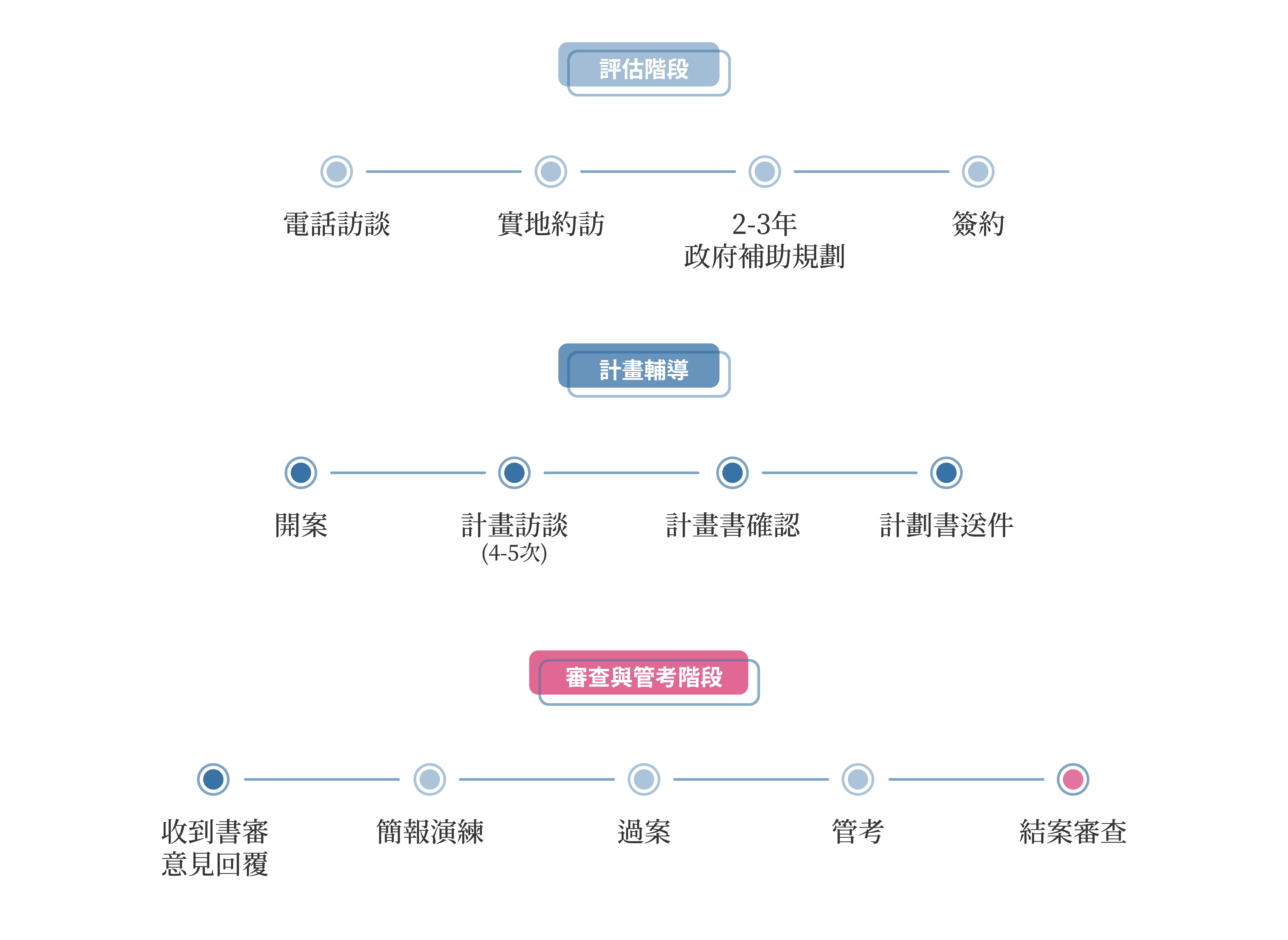 為您從創業草創期、擴張期到成長期提供完整的政府補助申請輔導,直至獲得補助後亦提供後續服務到計畫結束,讓您無後顧之憂。